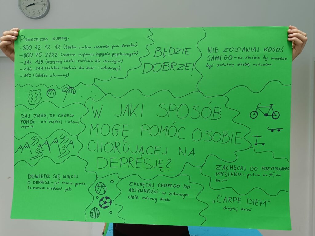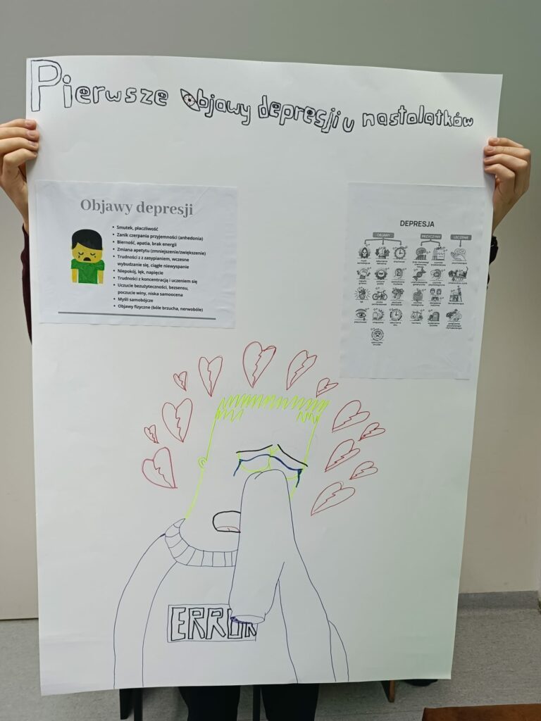 Na gazetce szkolnej pojawiły się również materiały informacyjne o objawach depresji, numerach wsparcia oraz hasła promujące troskę o dobrostan.Wierzymy, że podejmowane działania przyczyniają się do przełamywania tabu wokół zdrowia psychicznego, uczą empatii oraz pokazują, że proszenie o pomoc jest oznaką siły, a nie słabości.