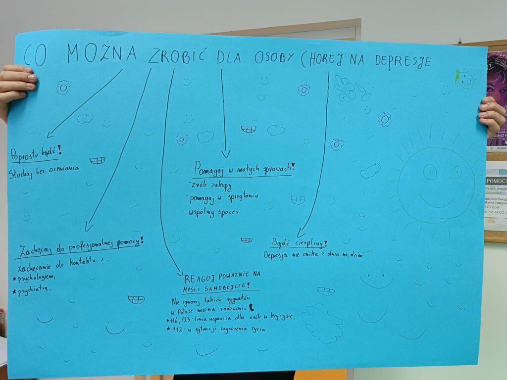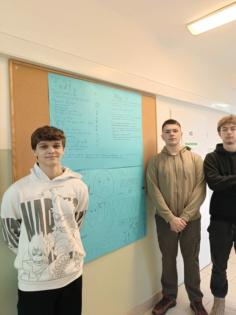 Uczniowie mieli również okazję zmierzyć się z najczęściej pojawiającymi się mitami na temat depresji, konfrontując je z faktami opartymi na wiedzy psychologicznej. Na zakończenie mogli anonimowo wypełnić kwestionariusz dotyczący stresu, lęku i nastroju, co sprzyjało zwiększeniu samoświadomości i umożliwiało wczesne rozpoznanie trudności.